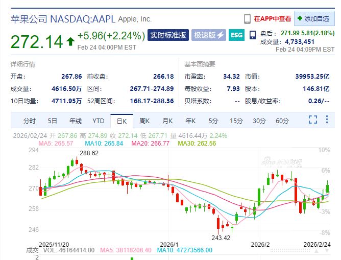 当地时间2月24日,美股三大指数集体收涨,纳指涨1.04%,标普500指数涨0.77%,道指涨0.76%。