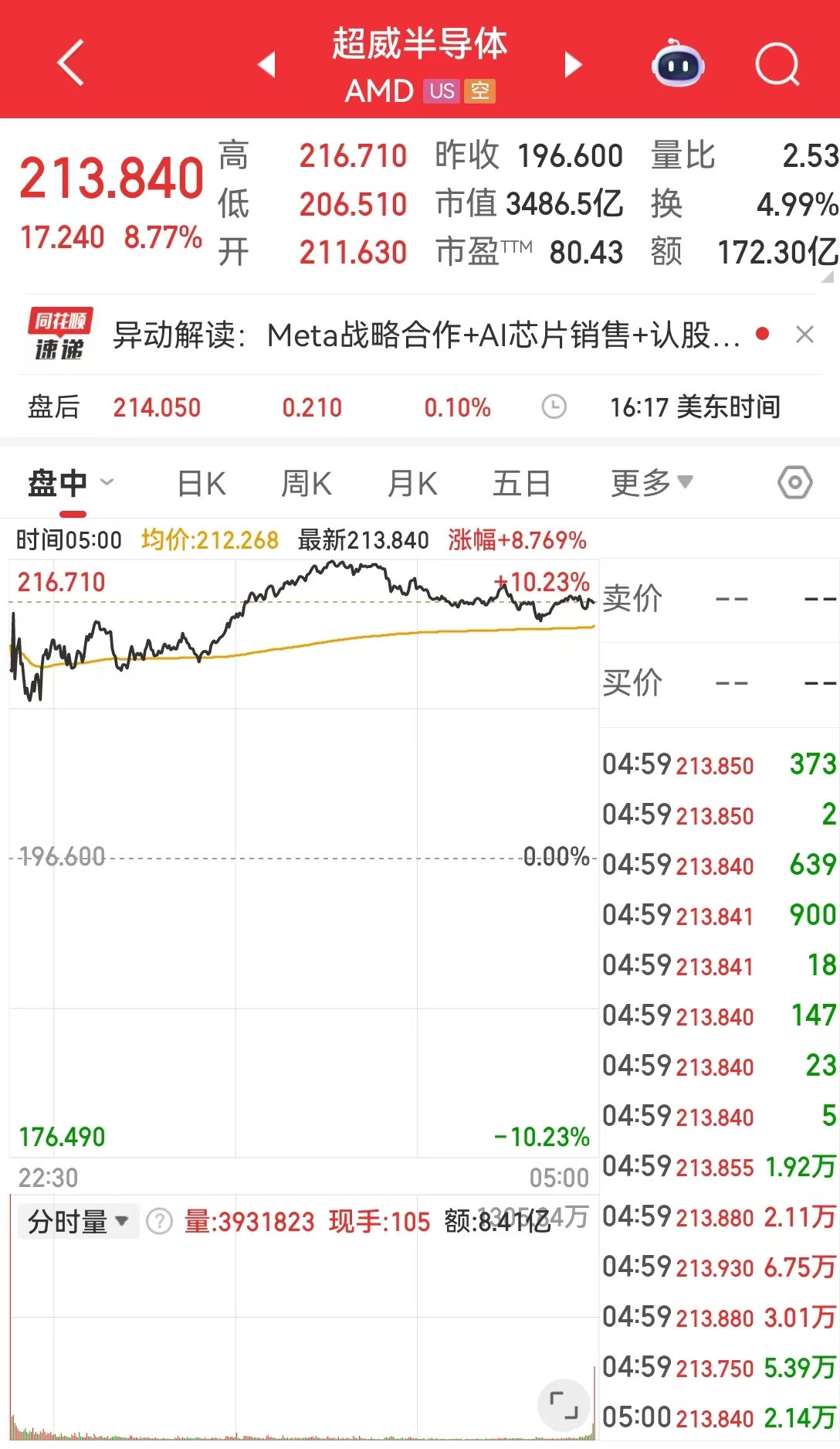 AMD涨超8%。据媒体报道,Meta与AMD达成了一项为期五年的重磅AI芯片及设备采购协议,交易总价值预计在600亿美元至逾1000亿美元之间。